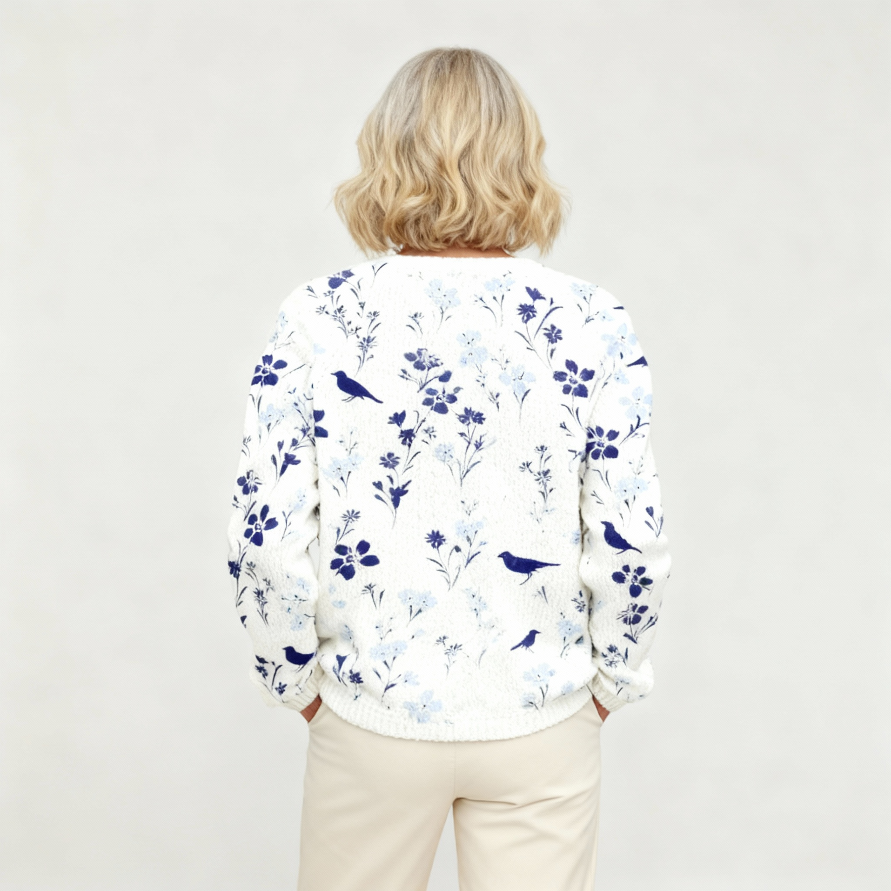 The Maylee Cardigan brings together delicate floral artwork and soft, cozy comfort. Its creamy knit base is decorated with vintage-inspired blue flowers and graceful little birds, creating a peaceful, romantic look that feels perfect for women who love subtle, refined beauty.